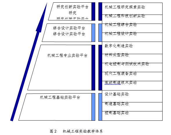 教学体系在“加强基础、突出创新、注重实践、整体优化”的原则下,改革实践教学体系、整合和提升实验教学内容贯彻“努力造就创新创业型人才与高素质领军人才”的实验教学新理念,确立了“一个中心、两个协同、三个开放、四个平台、五个结合”的实验实践体系,即以高素质人才培养为中心,以实践教学与理论教学协同、校内实验与企业实践协同为培养途径,实行教学时间开放、训练项目开放、面对所有学生开放的全开放式教学,构建机电工程基础实验、专业实验、综合设计实验和创新研究型实验的四个层次实验实践平台,教学中坚持教师引导与学生自主实践相结合、必做项目与选做项目相结合、课内与课外相结合、虚拟实验与实物操作相结合、知识考核与能力评价相结合的五结合教学与评价模式,如图2所示。 根据实验教学的改革方案和各实验室分工的不同,机械工程实验教学中心计划搭建“机械工程基础实验、机械工程专业实验、机械工程综合设计实验、机械工程研究创新实验”四级实验平台。中心总体结构如图2所示。