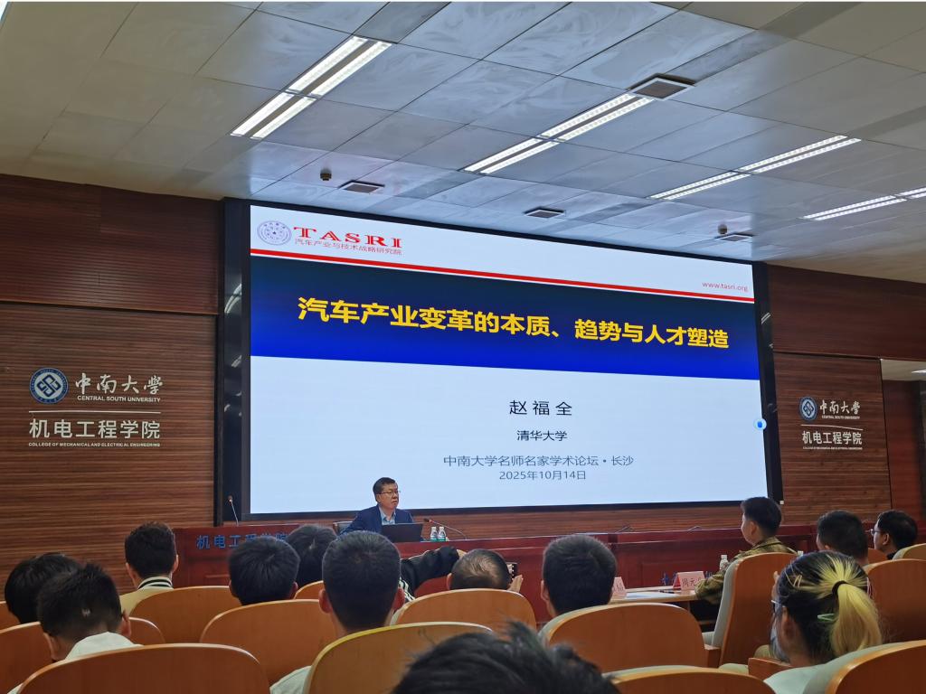 2025年10月14日晚,清华大学车辆与运载学院教授、汽车产业与技术战略研究院(TASRI)赵福全院长做客“中南大学名师名家…