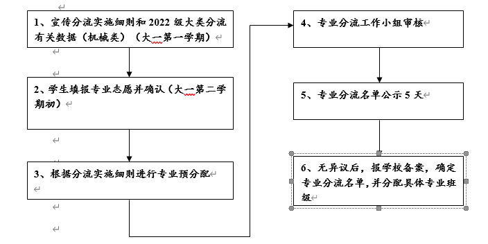 机械类专业分流工作从大一第二个学期四月份开始(具体时间以本科生院的通知为准),工作流程如下: