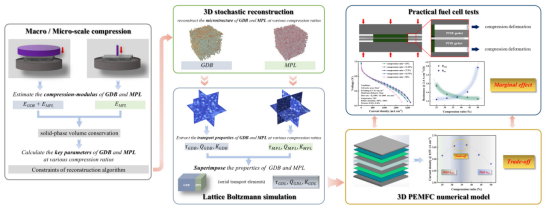 质子交换膜燃料电池(PEMFC)因其高效率、高功率密度以及零碳排放等特性被视为下一代车用动力的重要发展方向之一。气体扩散层(GDL)是压缩封装于PEMFC内部的关键组件,精确优选其压缩量对于提升燃料电池寿命与性能至关重要。然而,当前主流气体扩散层均由特征尺度差异较大(~2个数量级)的基底层与微孔层组成,使得以往的仿真、实验研究难以同时关注两个片层。因此,在综合考察基底层与微孔层的前提下实现GDL压缩量的快速寻优,对于进一步提升PEMFC性能至关重要。