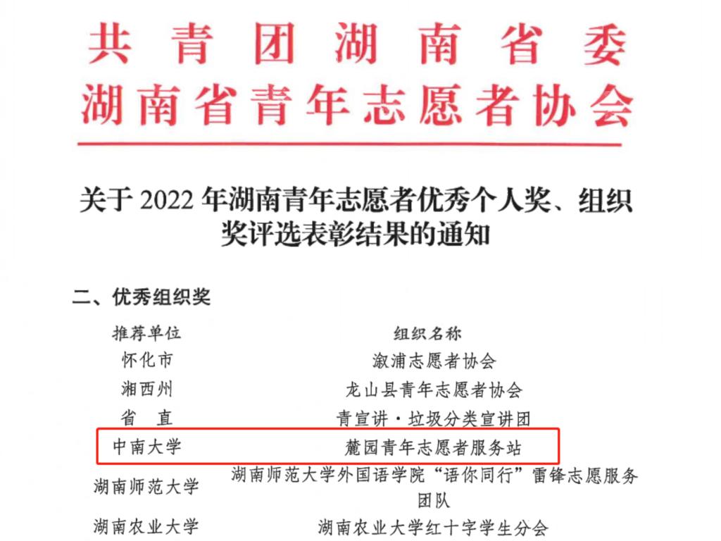 近日,共青团湖南省委、湖南青年志愿者协会联合发布了《关于2022年湖南青年志愿者优秀个人奖、组织奖评选表彰结果的通知》。通过个人申报、初评推报、资格审核、专家评审、结果公示等多个环节,评选出30名优秀个人奖、20个优秀组织奖。我院麓园青年志愿者服务站荣获“湖南青年志愿者优秀组织奖”。