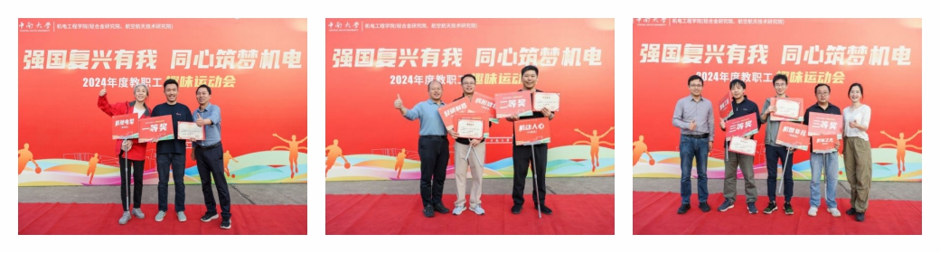 经过激烈角逐,机械电子工程系组成的“机驰电挚”代表队获得本次教职工趣味运动会团体一等奖,流变成形与控制系与先进材料与制备系组成的“成形健将+轻研制胜”组合代表队、院行政办公室组成的“机动人心”代表队获团体二等奖,机械制造及其自动化系组成的“机智非凡”代表队、微系统制造科学与工程系组成的“微制之光”代表队、工业训练中心组成的“智能工训”代表队获团体三等奖。在“飞盘投掷”个人赛项目中,女子组分别由周亮等3位教师获一等奖,刘介珍等6位教师获二等奖;男子组分别由周创鑫等10位教师获一等奖,周亚军等10位教师获二等奖。