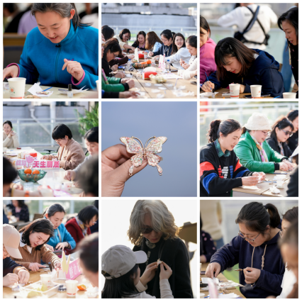 在特步俱乐部露台上,另一场关于技艺与美的对话正在上演。结合学院工程实践创新中心的特色课程,女职工们在指导老师的带领下,亲手制作螺钿DIY非遗贝壳胸针。从挑选胸针形状到镶嵌贝壳,每一步都凝聚着对传统工艺的敬畏与创新思考。活动中,大家相互欣赏、相互鼓励,传达着对美的感知和理解。经过1个多小时的努力,当一枚枚镶嵌着璀璨螺钿的胸针完美呈现时,现场响起阵阵掌声。参与者纷纷表示,这场活动不仅是一次手工艺的探索,更是一场跨越年龄与岗位的情感联结,大家在交流协作中感受到团队温暖,也在创作成果中收获了满满的成就感。