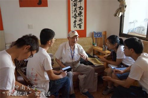 在抗战胜利70周年之际,追溯抗日战争的历史足迹,缅怀革命先烈艰苦奋斗、英勇无畏的抗战精神,中南大学机电工程学院暑期社会实践团队来到了长沙市望城区安华山庄抗战老兵照护中心,开展了“百团忆战,青春担当”社会实践活动,采访了102岁的抗战老兵王光亚同志。