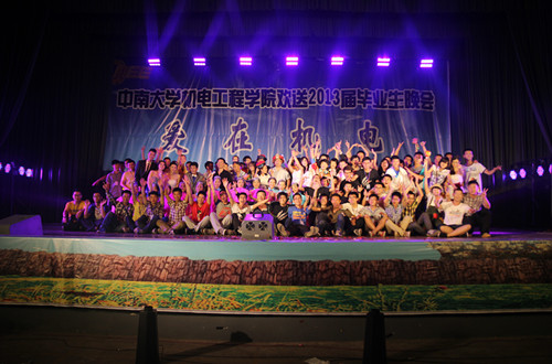 灯光点亮绚丽舞台,歌舞放飞青春梦想。6月1日下午7点,机电工程学院“爱在机电”2013届毕业生晚会在南校电影院准时开演。出席晚会的嘉宾有中南大学学工部李景升部长、机电工程学院党委李登伶副书记,机电工程学学院王艾伦副院长、张怀亮副院长、湛利华副院长,院关工委刘世勋常务副主任及其他老师。他们和全体09级毕业生及其他年级的机电学子共同观看了此次晚会。
