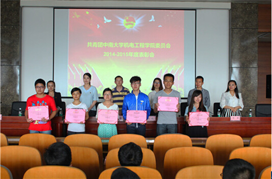 2015年5月9号,机电工程学院五四评优表彰大会于下午四点在机电楼B214隆重举行。出席此次表彰大会的有共青团中南大学委员会王超副书记、中南大学机电工程学院党委马俊副书记、共青团中南大学机电工程学院委员会周芳书记,李传良常务副书记12级辅导员周芳和童俊杰老师、13级辅导员何婷老师、14级辅导员肖楚楚老师以及全体团学会成员,优秀团干、团员和团支部代表。