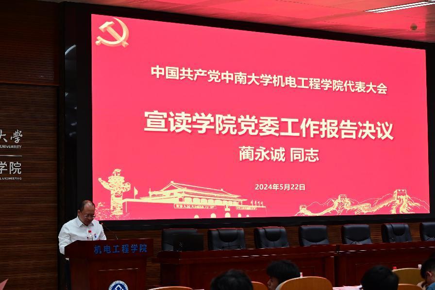 5月22日下午,中国共产党中南大学机电工程学院代表大会在中铝科技大楼B214报告厅隆重召开。中南大学党委常委、副校长陈立章,中国工程院院士钟掘,中南大学纪委第二纪检监察室主任杨帆,特邀代表,列席代表等出席大会,学院党代会正式代表163人参加大会。