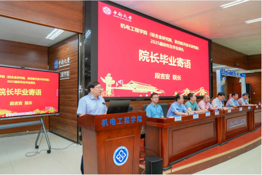 6月18日,机电工程学院(轻合金研究院、航空航天技术研究院)在中铝科技大楼B214报告厅举行了2025届毕业生毕业典礼。中国工程院院士钟掘,机电工程学院党委书记肖来荣、院长段吉安,航空航天技术研究院院长罗世彬,轻合金研究院副院长易幼平等全体院领导,各系所、行政办公室教师代表出席,800余名毕业生及60余名家长代表参加。典礼由学院党委副书记李玲芝主持。