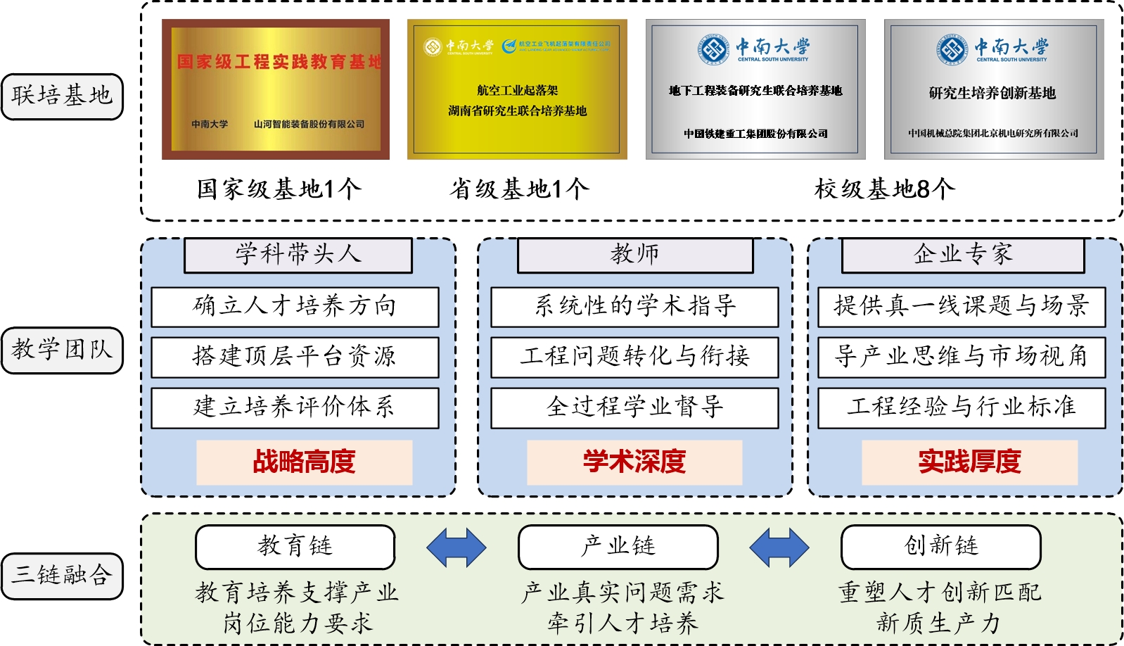 成果以“产教融合、师生共创”为核心,通过教育链、创新链、产业链“三链耦合”,打通人才培养与产业需求之间的壁垒。学院与山河智能、中航工业起落架等龙头企业共建国家级、省级研究生联合培养基地10个,实施“揭榜挂帅”机制,推动研究生在真实工程场景中锤炼能力。企业导师深度参与开题、中期、答辩全流程,形成“学术导师+产业导师”双轨指导体系,显著提升人才培养与产业需求的契合度。