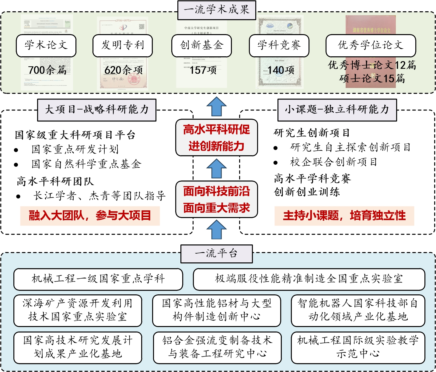 依托机械工程国家一级重点学科、极端服役性能精准制造全国重点实验室等平台,构建“国家级大项目牵引+自主小课题探索”双轨科研育人体系。研究生既能参与国家重大研发计划、自然科学基金等重点项目,培养系统攻关能力;又能自主申请创新课题、参与学科竞赛,激发原始创新活力。近五年,研究生参与国家级项目140余项,发表高水平论文700余篇,获授权发明专利620余项,获省级以上科技奖10项。