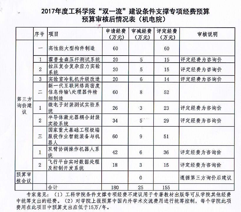 附件:《关于反馈工科学院“双一流”建设条件支撑专项预算审核后意见的通知》及《2017年度工科学院“双一流”建设条件支撑专项经费预算审核后情况表(机电院)》
