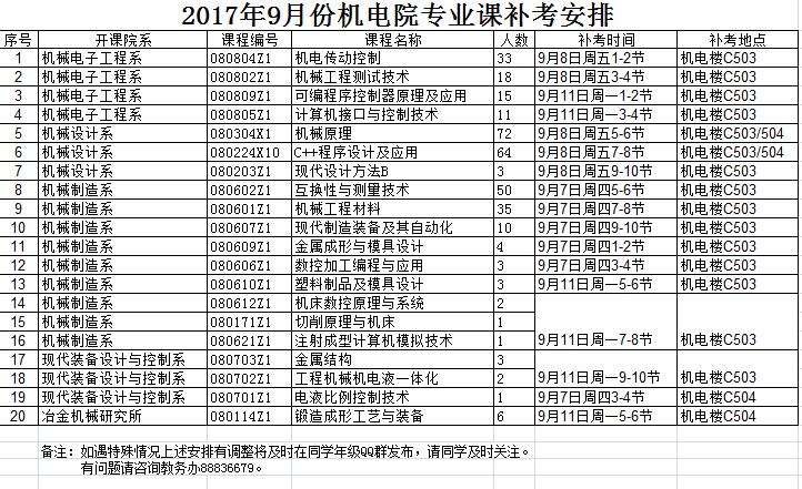 2017年9月份机电院专业课补考安排
