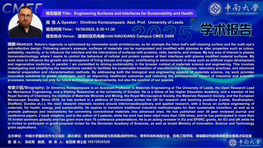 中南大学第六届国际青年学者湘江论坛机械工程分论坛学术报告预告