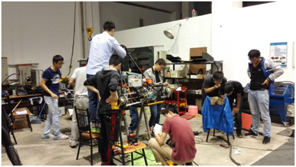 实验室开放——中南大学方程式赛车队发布时间:2016-11-21 浏览次数: 中南大学方程式赛车队成立于2015年1月,是一支由车辆工程系老师为指导老师、中南大学学生为开发设计主体的项目团队,队员以来自机电院的学生为主,兼有信息院、交通院、商学院等不同院系的学生,年级跨度为本科一年级至研究生二年级,目前骨干队员有52人,其中本科生47人,研究生5人。车队成立1年多以来,作为湖南省唯一一支纯电动方程式赛车队,已成功设计、制造出了两辆方程式赛车,并代表中南大学参加了中国大学生电动汽车大赛(FSEC),取得了较好的成绩。赛车队下设技术部和运营部两大部门,技术部下设动力总成、车身总成、底盘总成三个整车技术组,负责整车的设计、制造、调试和比赛;运营部负责整车的成本报告、营销报告和车队外联、宣传、赞助以及基本的日常管理等。 实验室的生活:车队成员都是利用有限的课余时间及各种假期来设计、制造、组装赛车。