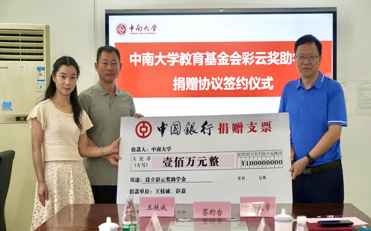 情系母校,爱心传递。9月11日,我校机电院95级校友、昆明通合汽车贸易有限公司总经理王枝诚、执行董事彭嘉夫妇向中南大学捐赠100万元,设立彩云奖助学金,旨在帮助机电工程学院、材料科学与工程学院大学生圆梦大学,激励优秀学生勤奋学习、刻苦钻研。上午1...